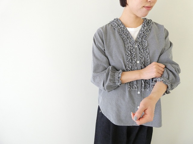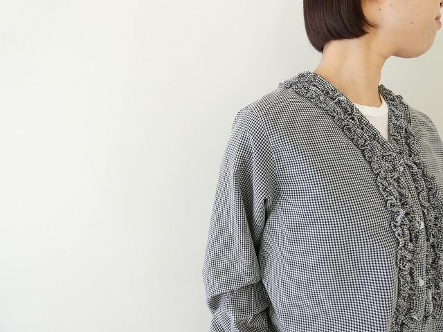 やわらかな風合いのブラックギンガムに、フロントのフリルがさりげなく映える一枚です。