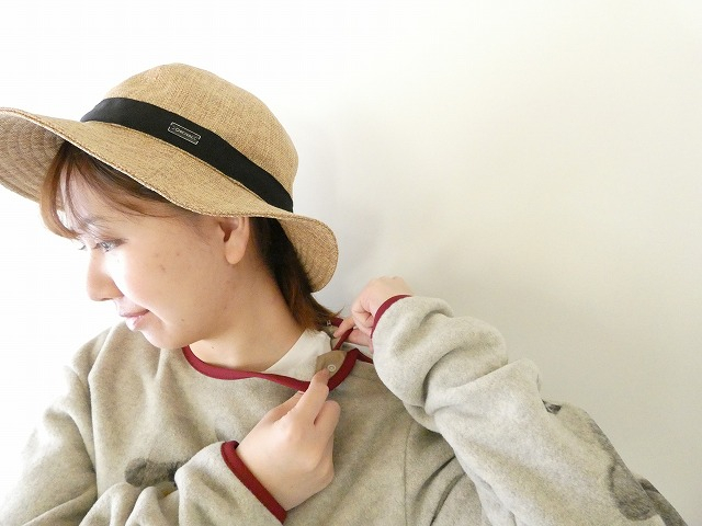 首元・袖口・裾にはえんじ色のパイピングをあしらい、全体をやさしく引き締めるアクセントに。