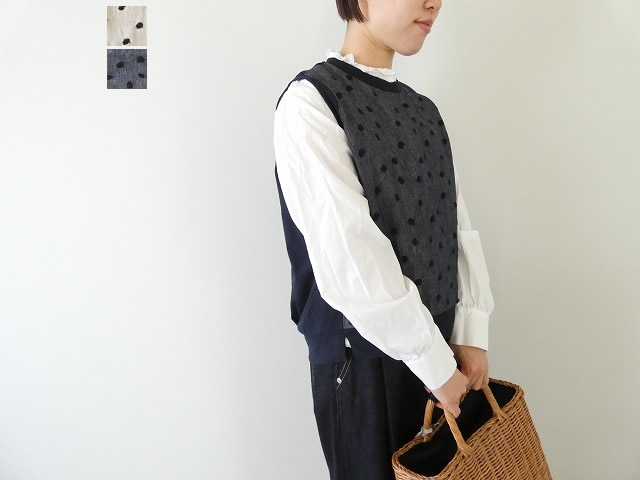 やわらかな表情のドット刺繍が目を引く、切替デザインのプルオーバーベスト。