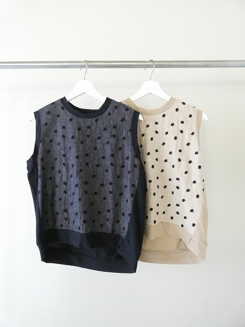 強撚引き揃え天竺リネンコットンランダムドット刺繍切替プルオーバーベスト